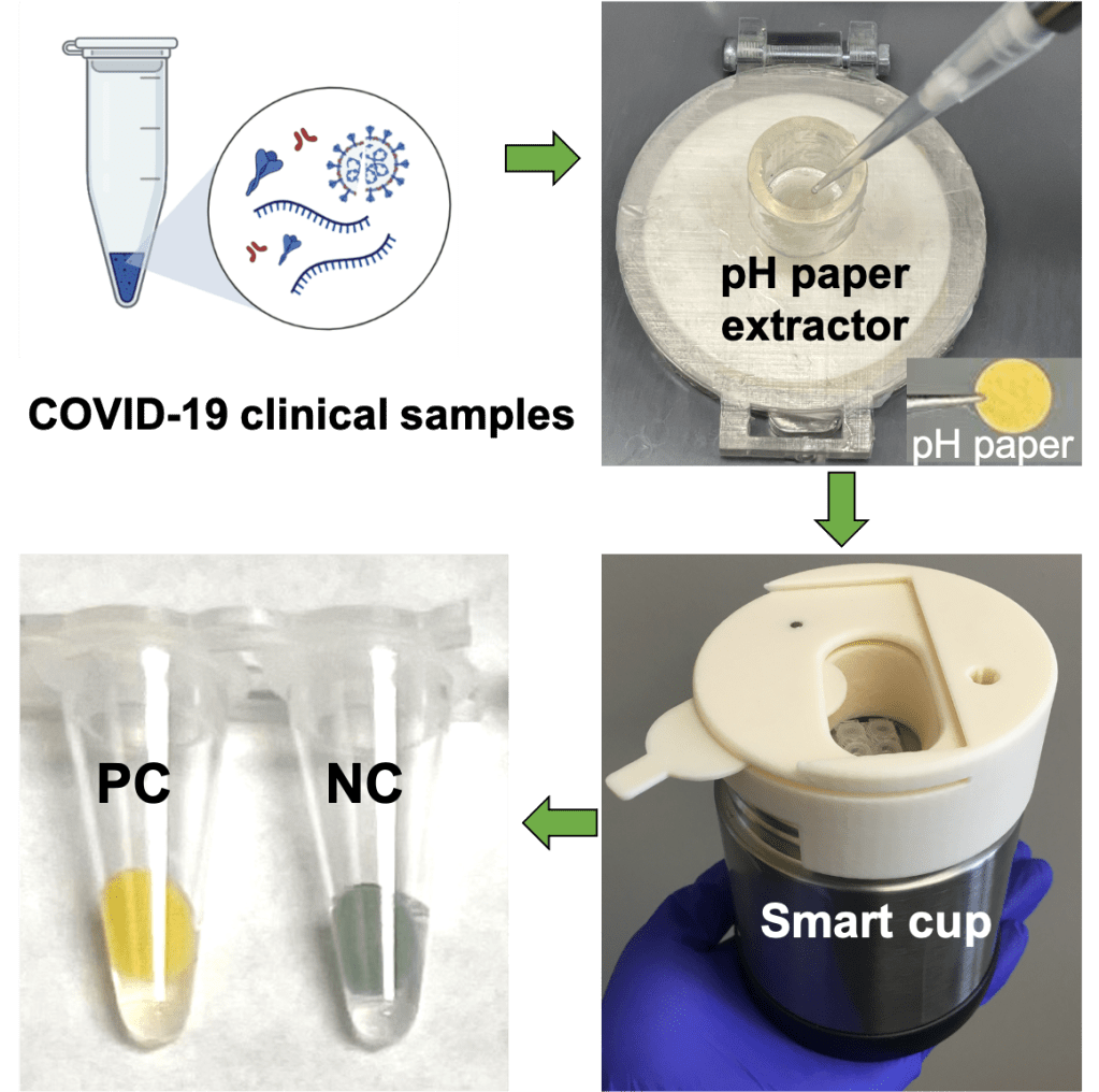The ongoing pandemic of coronavirus disease 2019 (COVID-19) caused by severe acute respiratory syndrome coronavirus 2 (SARS-CoV-2) has caused millions of deaths worldwide. However, most SARS-CoV-2 detection methods depend on time-consuming sample preparation and large detection instruments. Herein, a method employing nonbleeding pH paper to achieve both RNA extraction and visual isothermal amplification is proposed, enabling rapid, instrument-free SARS-CoV-2 detection. By taking advantage of capillary forces, pH-paper-based RNA extraction can be accomplished within 1 min without need for any equipment. Further, the pH paper can mediate dye-free visual isothermal amplification detection. In less than a 46-min sample-to-answer time, pH-paper-based extraction and visual detection (termed pH-EVD) can consistently detect 1200 genome equivalents per microliter of SARS-CoV-2 in saliva, which is comparable to TaqMan probe-based quantitative reverse transcription PCR (RT-qPCR). Through coupling with a chemically heated incubator called a smart cup, the instrument-free, pH-EVD-based SARS-CoV-2 detection method on 30 nasopharyngeal swab samples and 33 contrived saliva samples is clinically validated. Thus, the pH-EVD method provides simple, rapid, reliable, low-cost, and instrument-free SARS-CoV-2 detection and has the potential to streamline onsite COVID-19 diagnostics.
